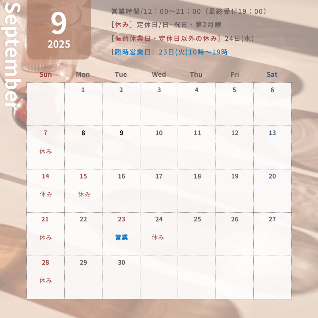 9月の営業は下記のとおりです。